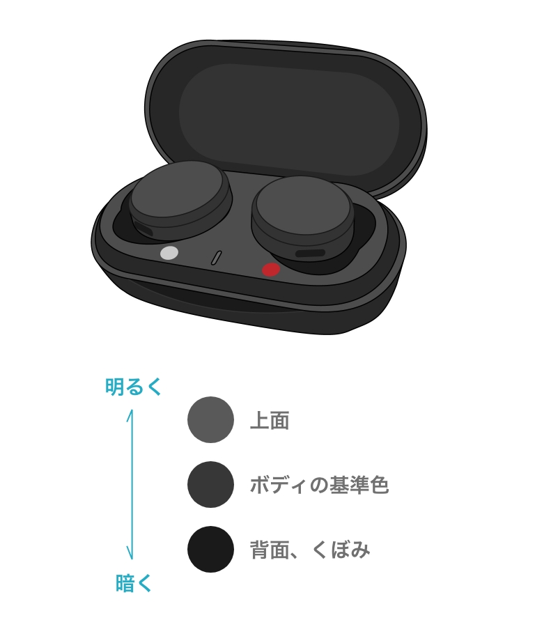 次は着色です。立体感を出すためには、それぞれの面の色に濃淡差をつけることがポイント! ボディの色を基準にして、上面は光が一番当たるので明るく、背面やくぼんでいるところ、影などは暗めにします。